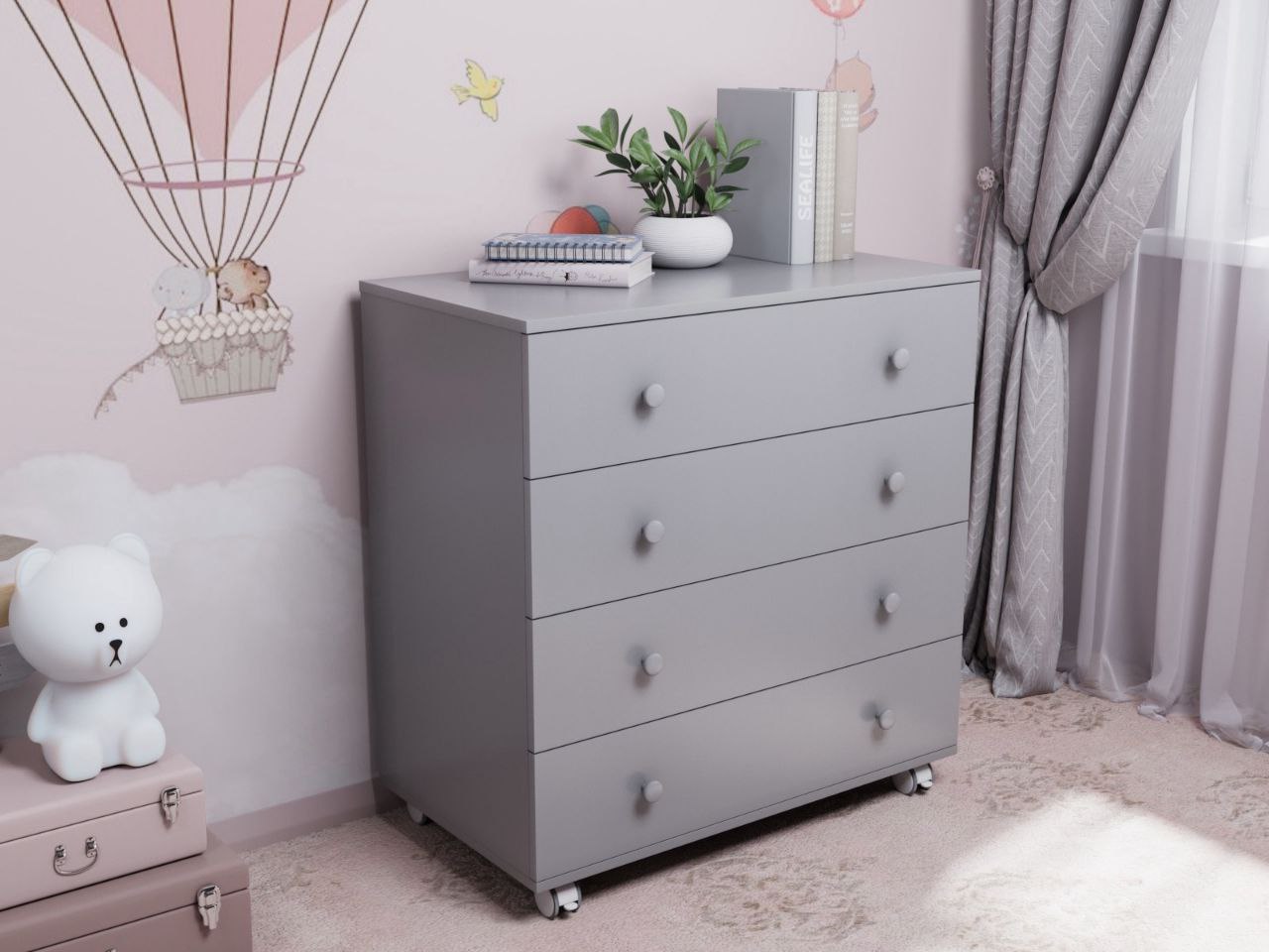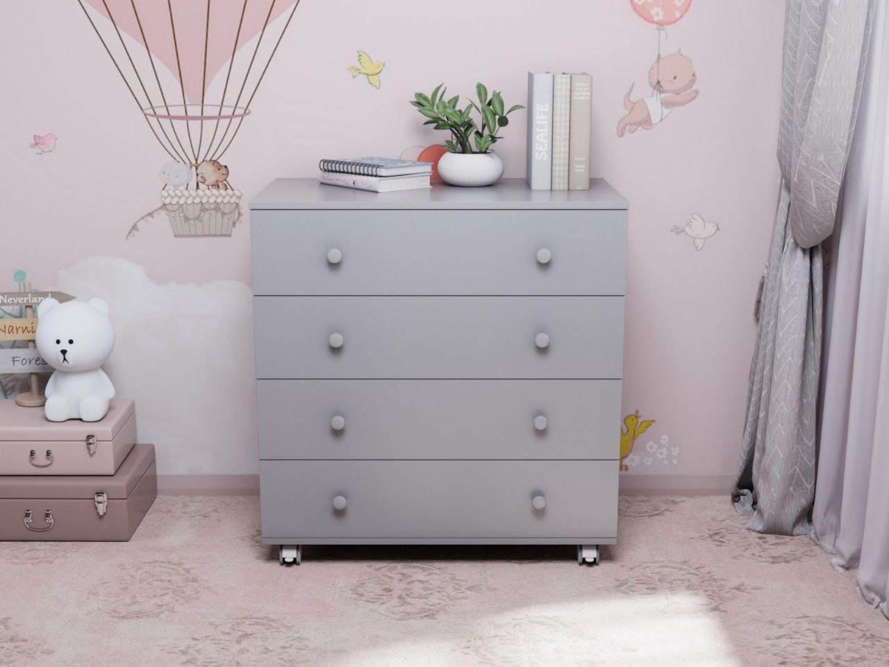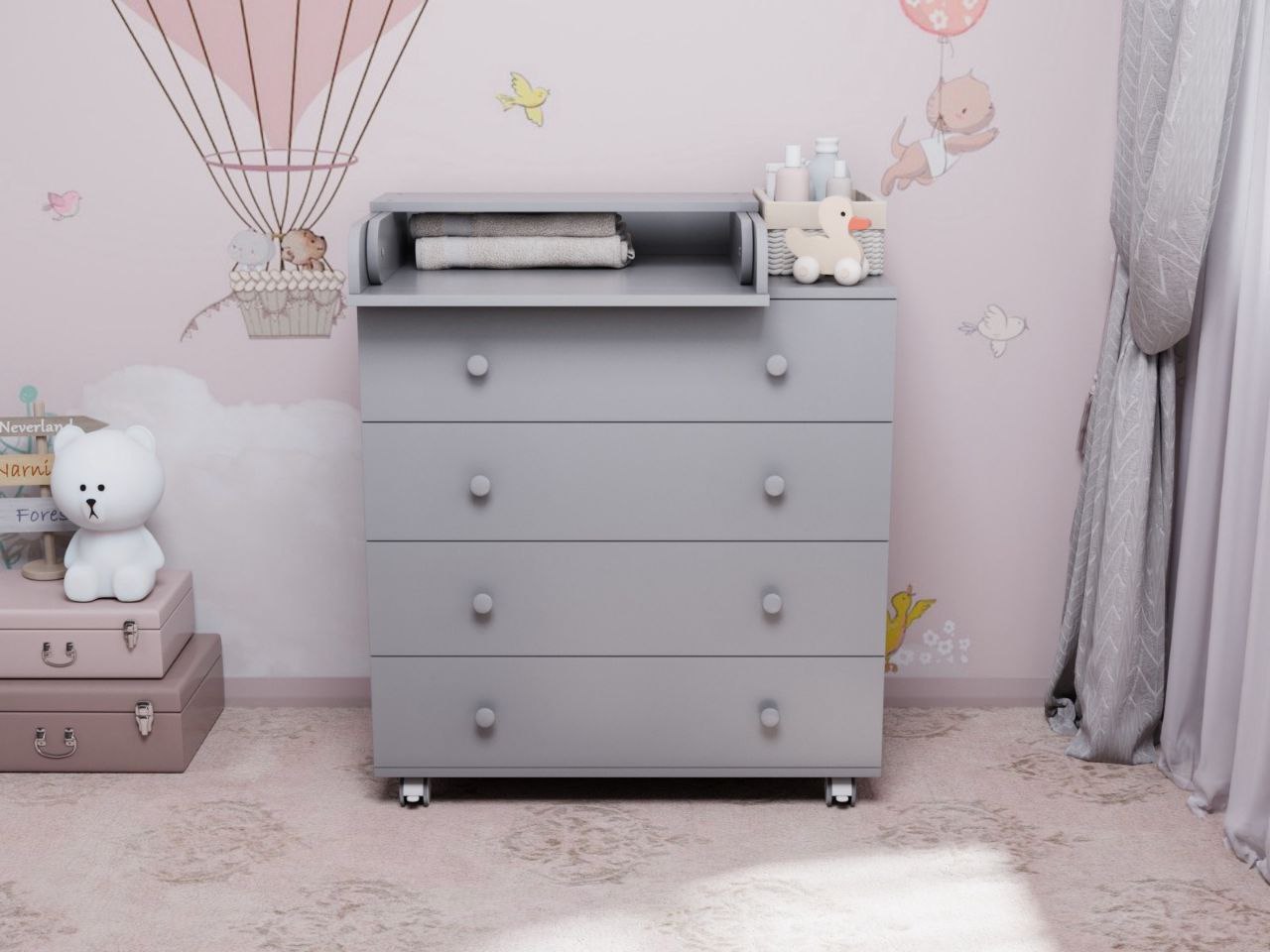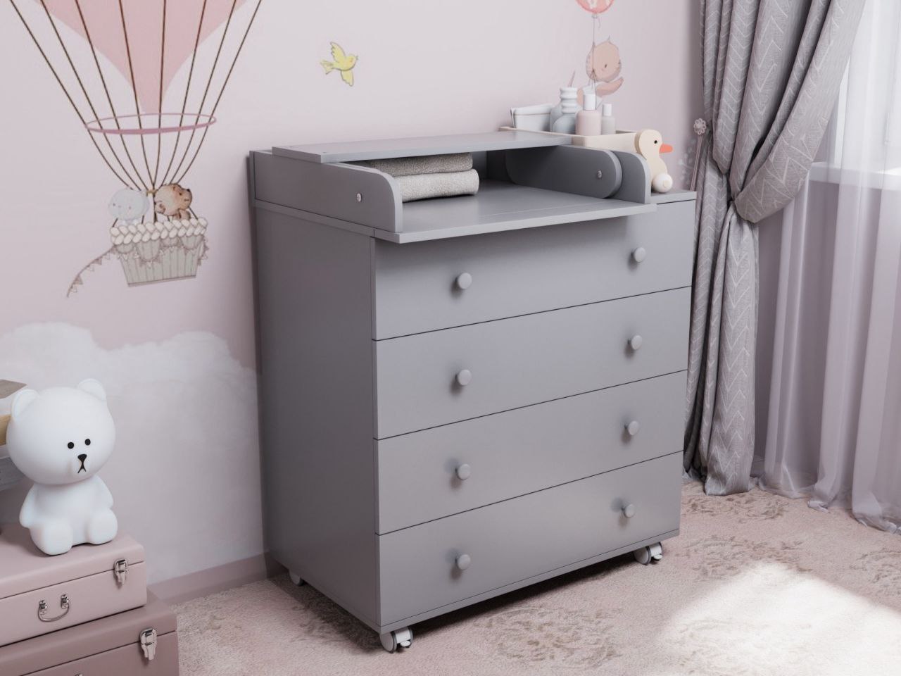 4 вместительных ящика, верхний ящик с органайзером, обеспечат максимальный комфорт при хранении детских принадлежностей. Если убрать пеленальную полочку, то комод можно использовать как обычный бельевой без демонтажа и отверстий.